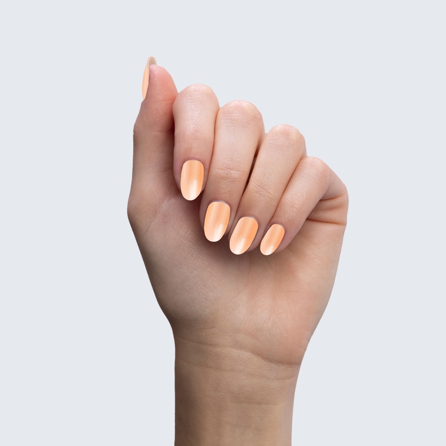 Peachy orange. Pastel. Pearl finish. Opaque. Cool undertone.